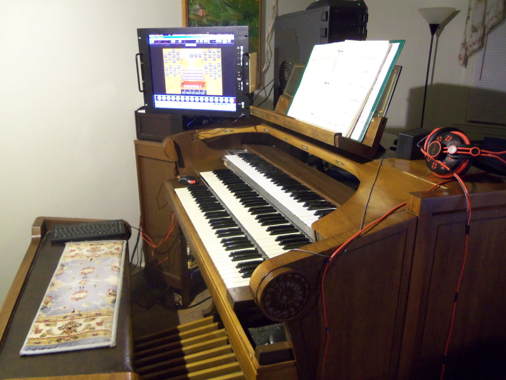 Console case, manuals, and pedals salvaged from Hammond Regent, with MIDI cards from Roman Sowa.